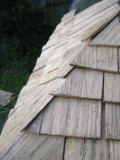 While on holiday I visited Coyle Timber Products in Bath and met with Joe Coyle the founder who showed me making the hand-made oak shakes by splitting 13" oak sections of oak trunks. He also told me the basic principles of laying the shakes and managing the ridges. I ordered 20 square metres of tiles.
